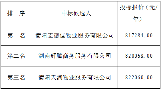 衡陽弘湘國有投資(控股)集團有限公司院內物業服務采購項目中標候選人公示